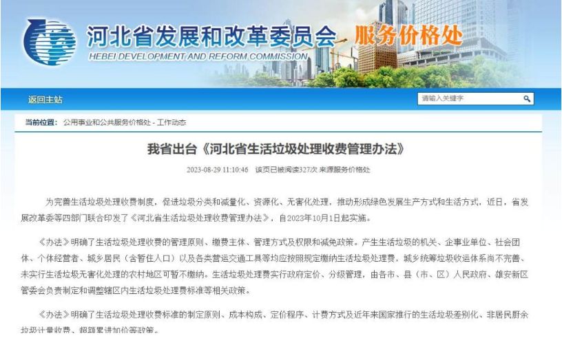 为完善生活垃圾处理收费制度,促进垃圾分类和减量化、资源化、无害化处理,推动形成绿色发展生产方式和生活方式,近日,河北省发展改革委等四部门联合印发了《河北省生活垃圾处理收费管理办法》,自2023年10月1日起实施。